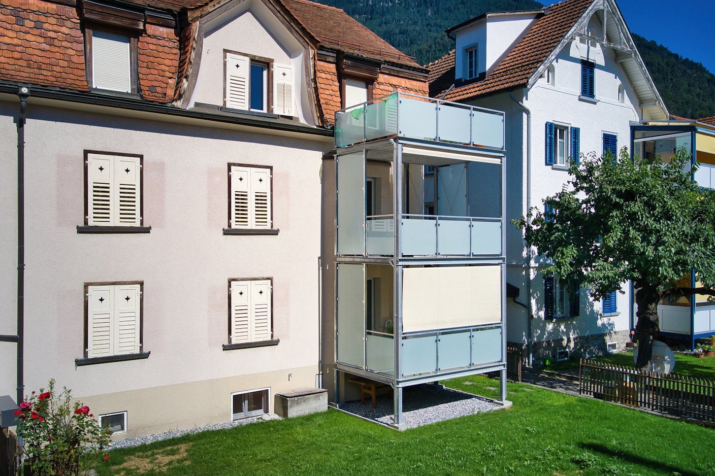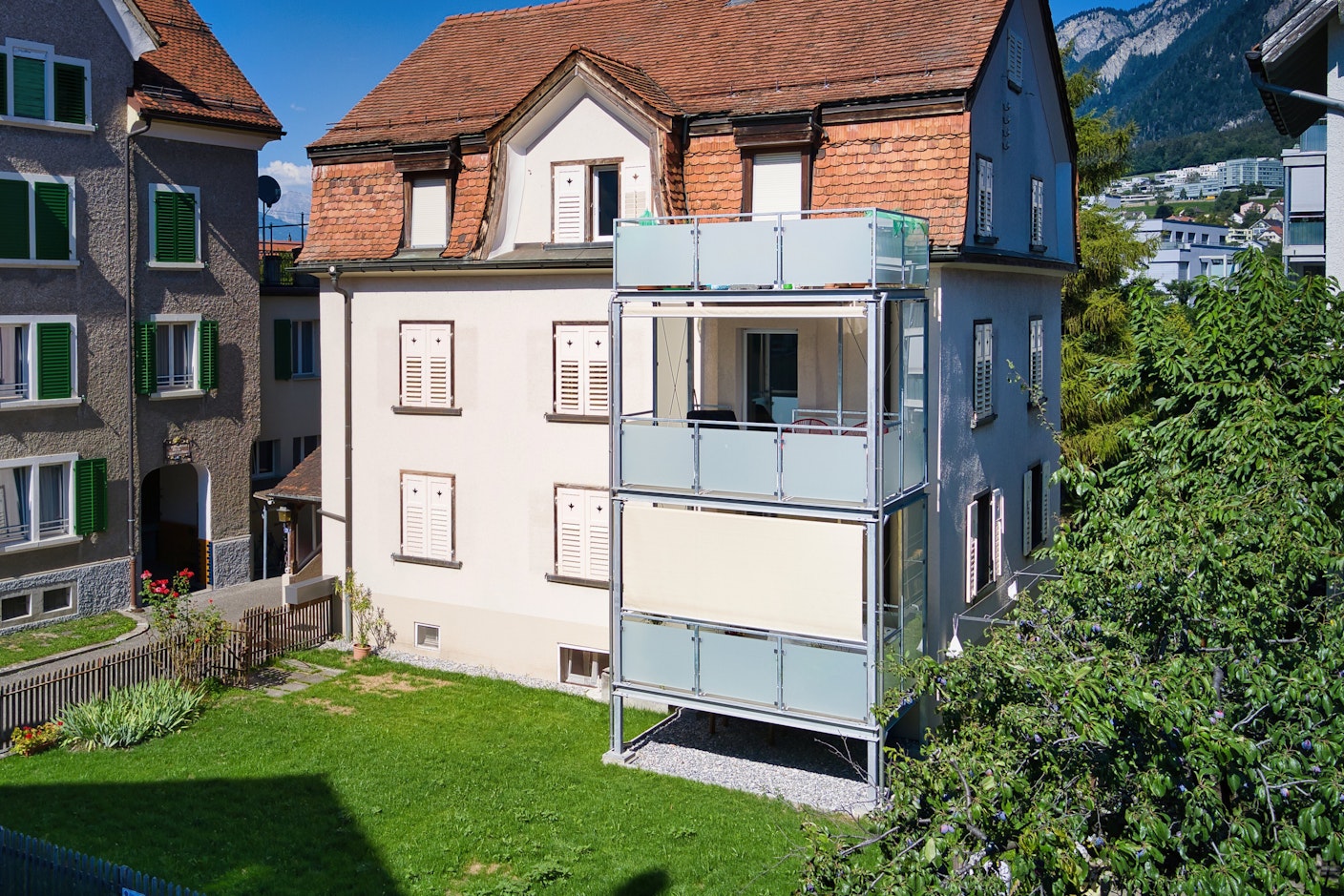 Balkonanlage mit Geländern, Winschutzwänden und Beschattung