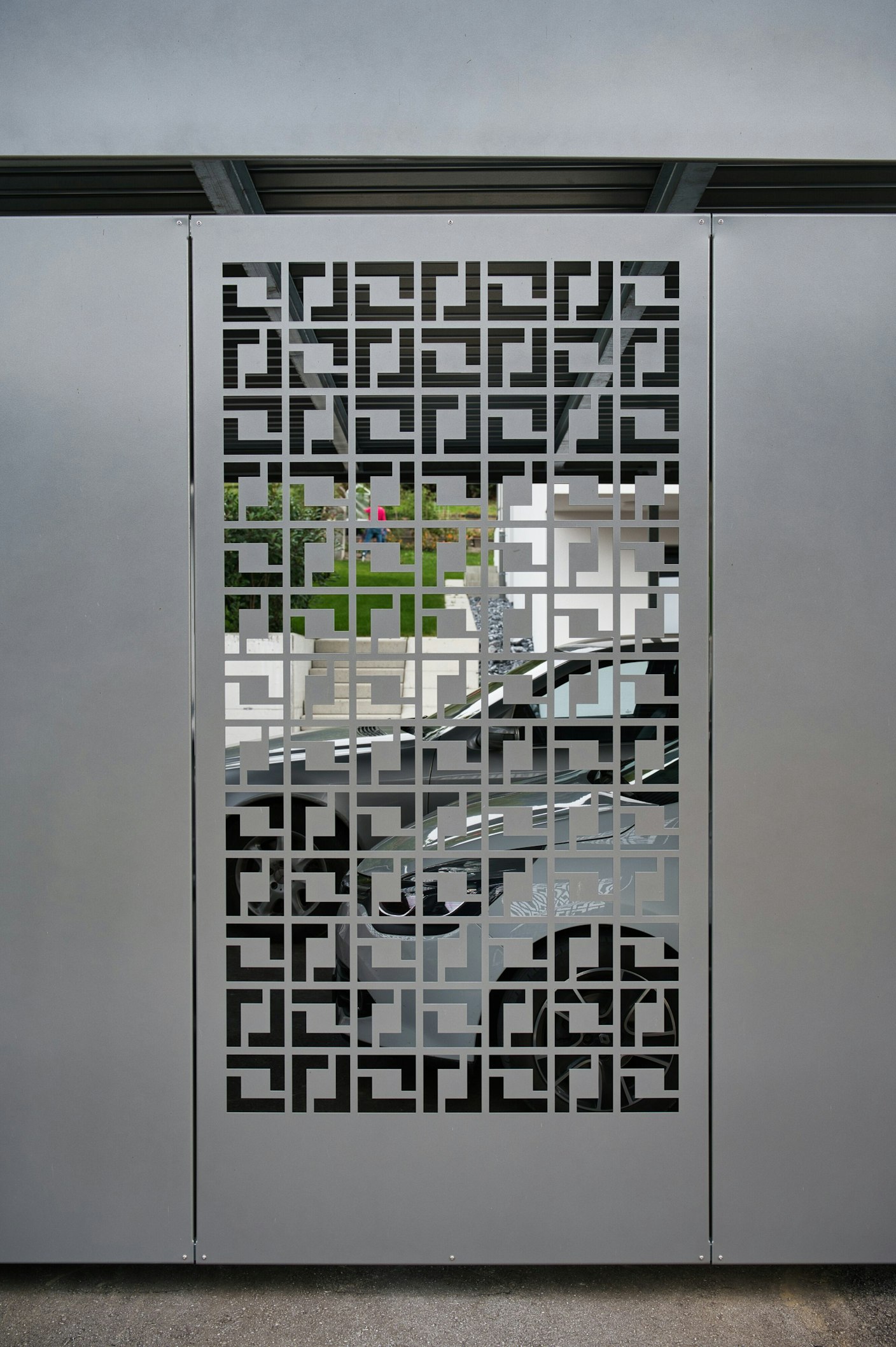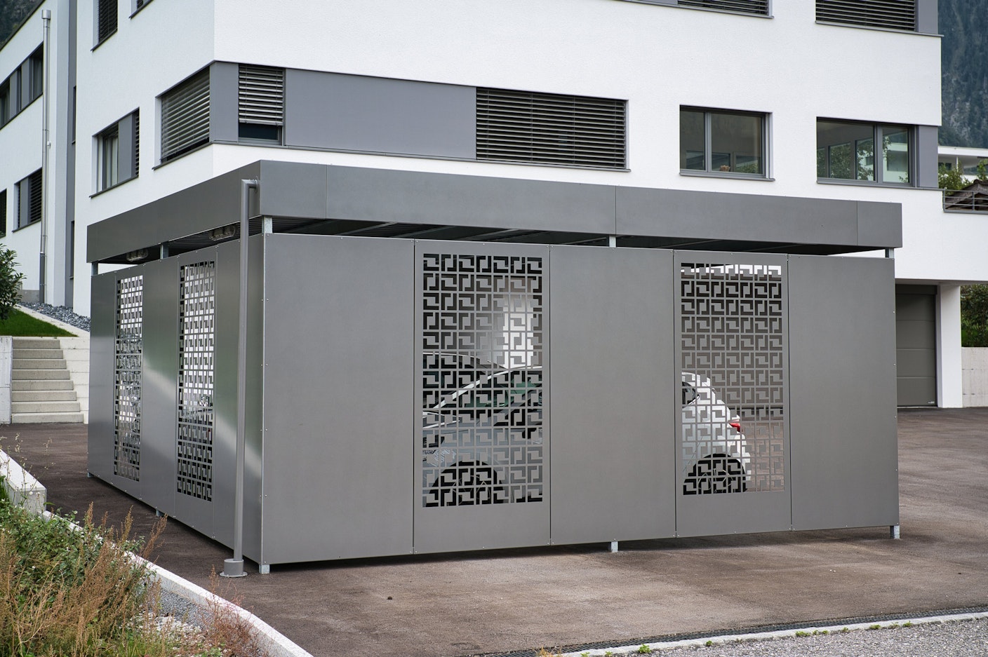 Carport ausgeführt als Stahlkonstruktion mit bekiestem Dach und verblechten Seitenwänden