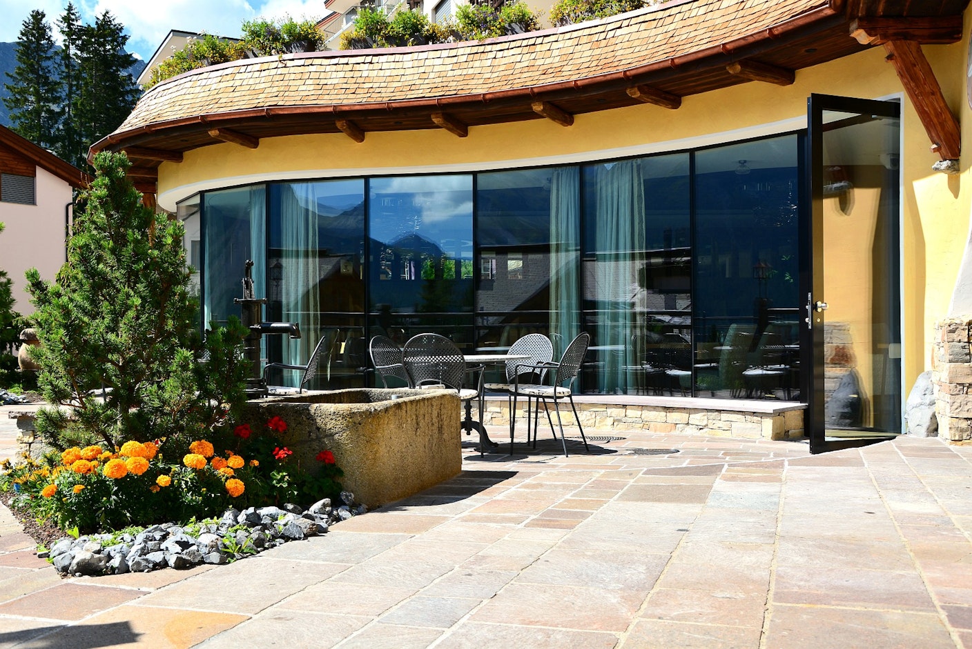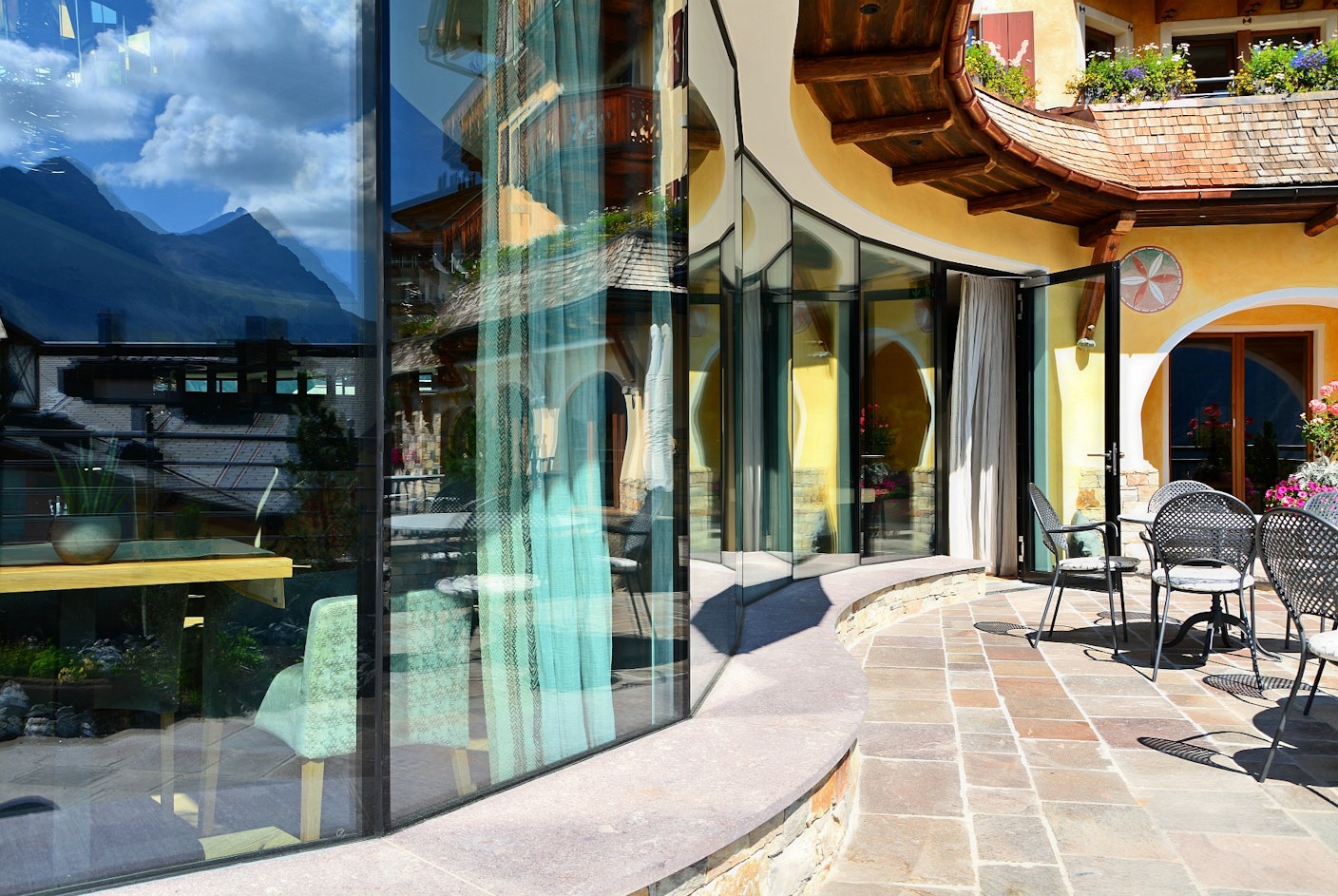 Aussenverglasung segmentförmig in Ganzglasoptik mit ingegrierter Türe