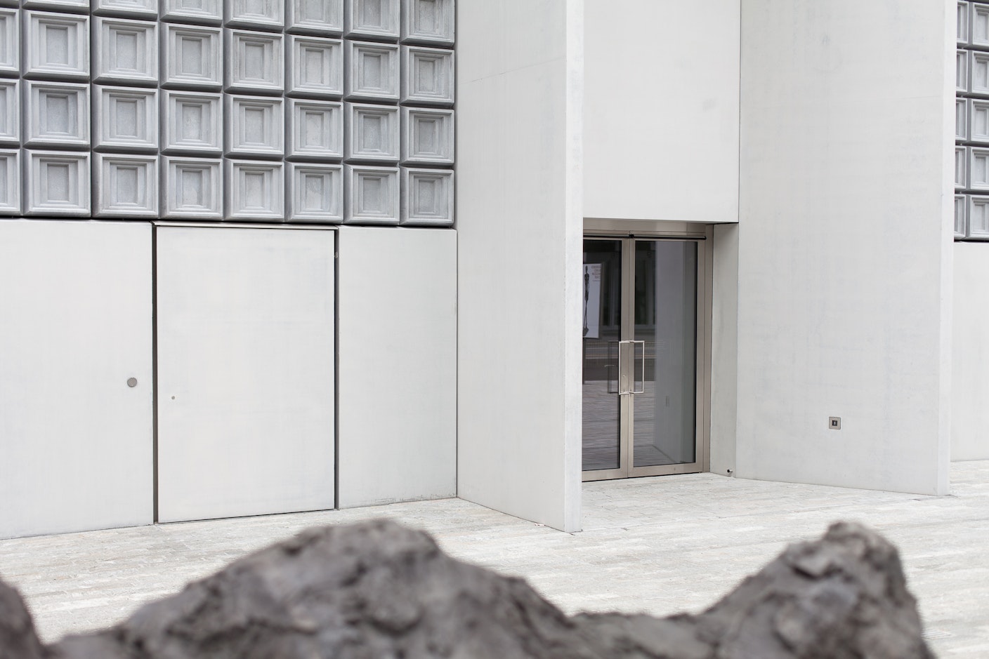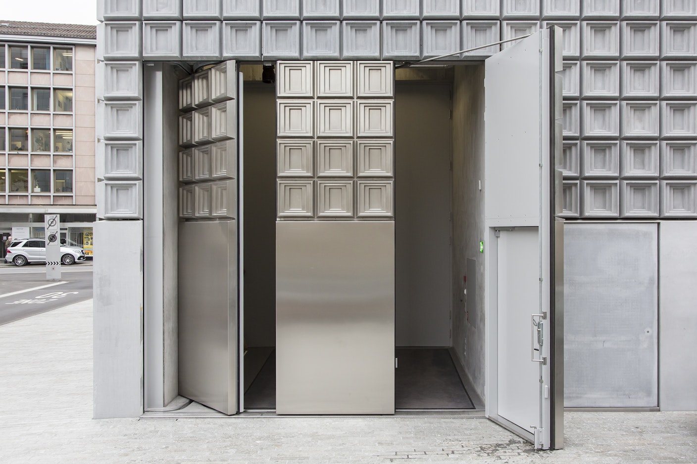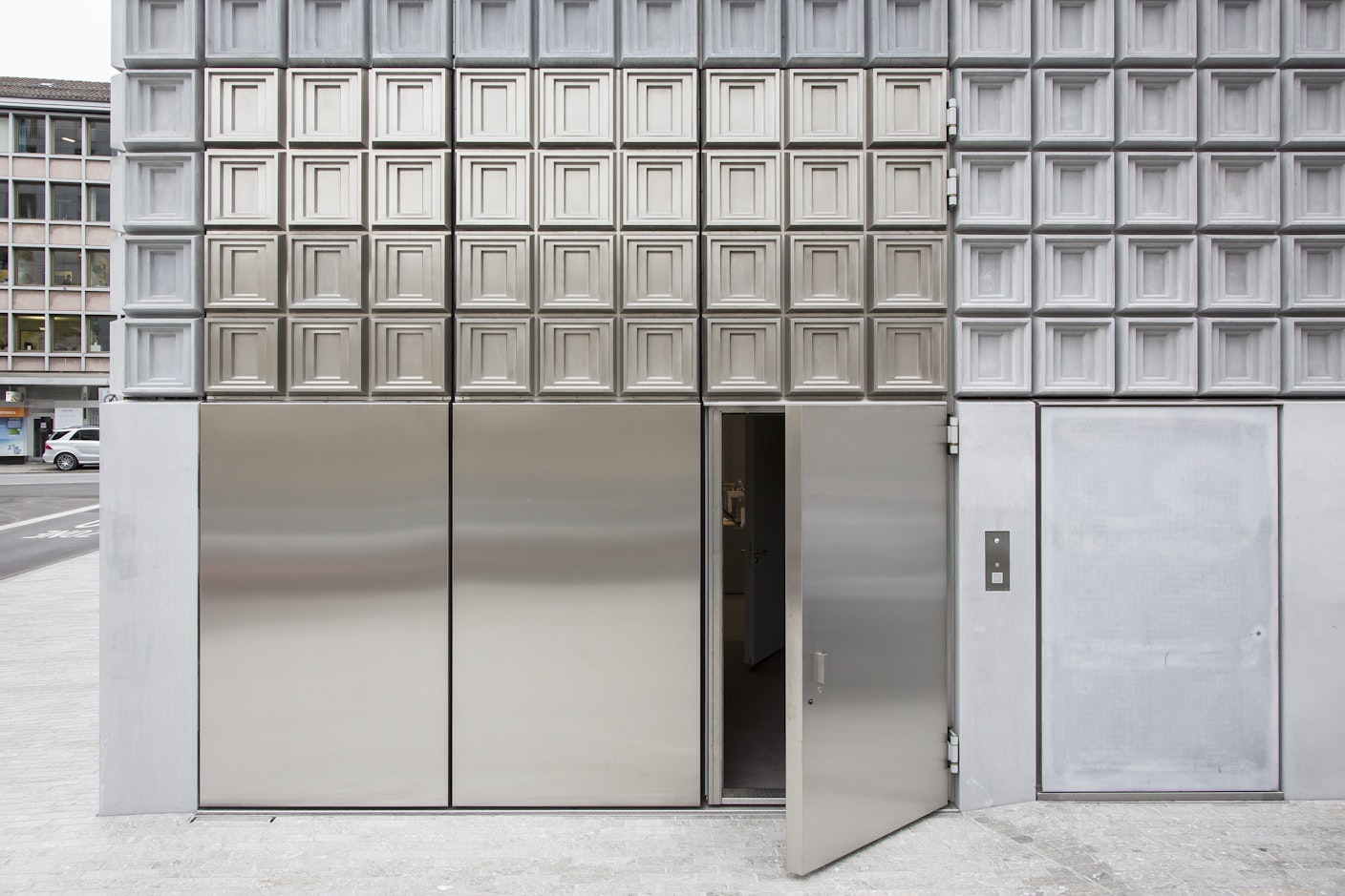 - Toranlage in Eigenfertigung mit Dreh- und Schiebeflügel integriert in Fassade mit spezial gefertigten Chromstahl Kachelelementen