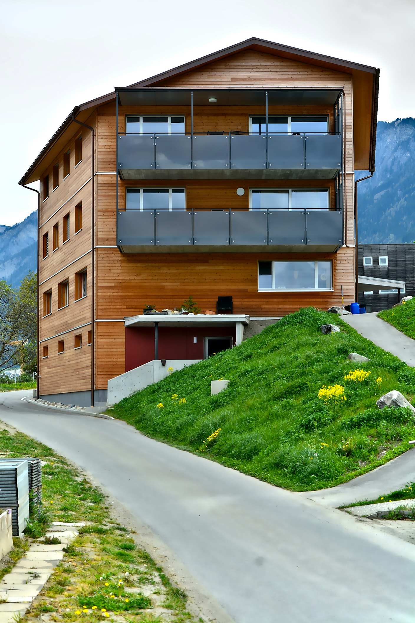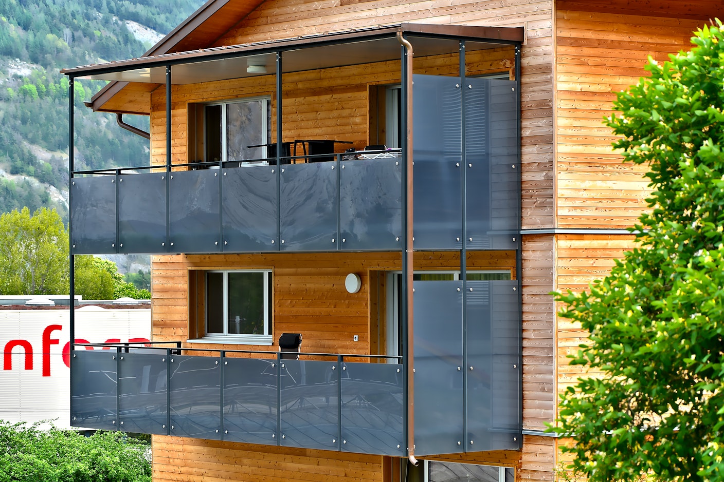 Balkonanlage mit Sichtschutzgeländern und Dachkonstruktion